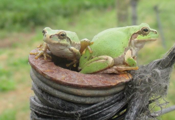 農園のいたるところにいるかえる。鉄柱の上で2匹休憩中。